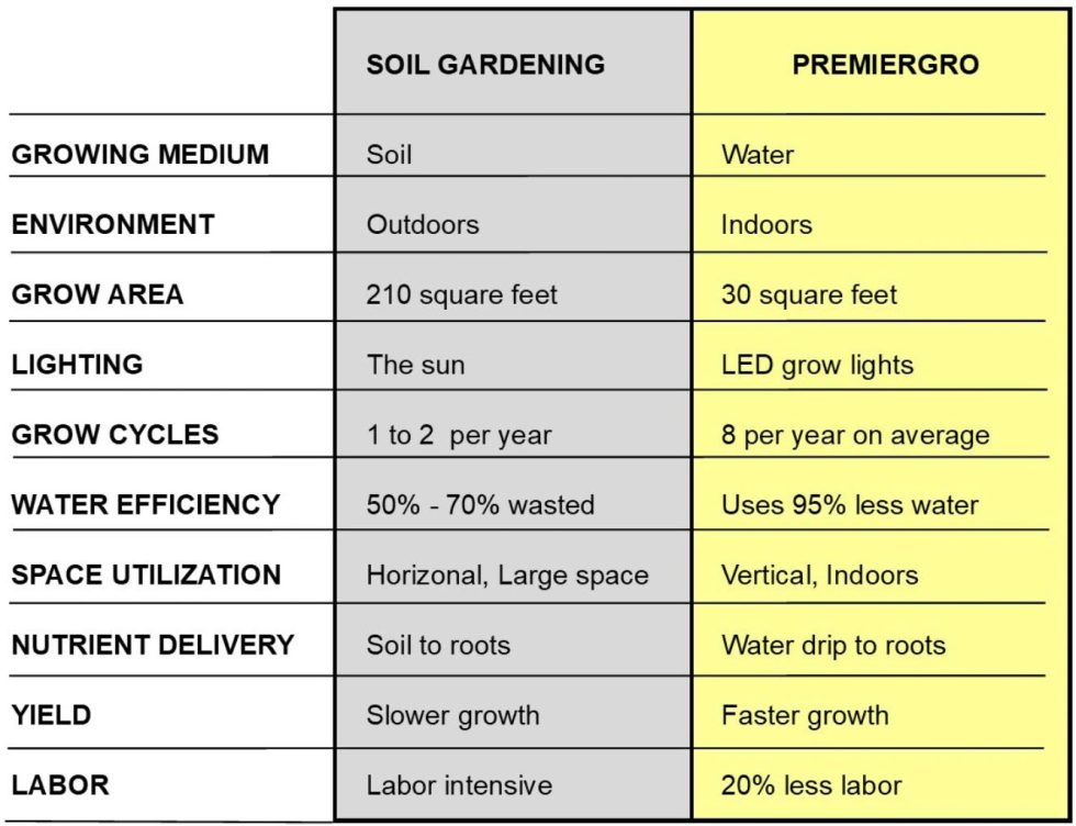 An analysis of two distinct growing systems and 10 popular crops produced surprising results. A traditional 210 sq ft soil garden would yield a substantial 2,343 pounds of vegetables and herbs. Remarkably, PremierGro’s 30 sq ft aeroponic system would produce a nearly identical yield of 2,342 pounds. The key to PremierGro’s efficiency lies in its ability to cultivate year-round, completing 8 growth cycles compared to the soil garden’s single annual cycle.